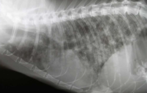 肺転移、胸腔内リンパ節腫脹を確認します、転移性ネコ乳癌はX線写真では不明瞭な結節として現れます。